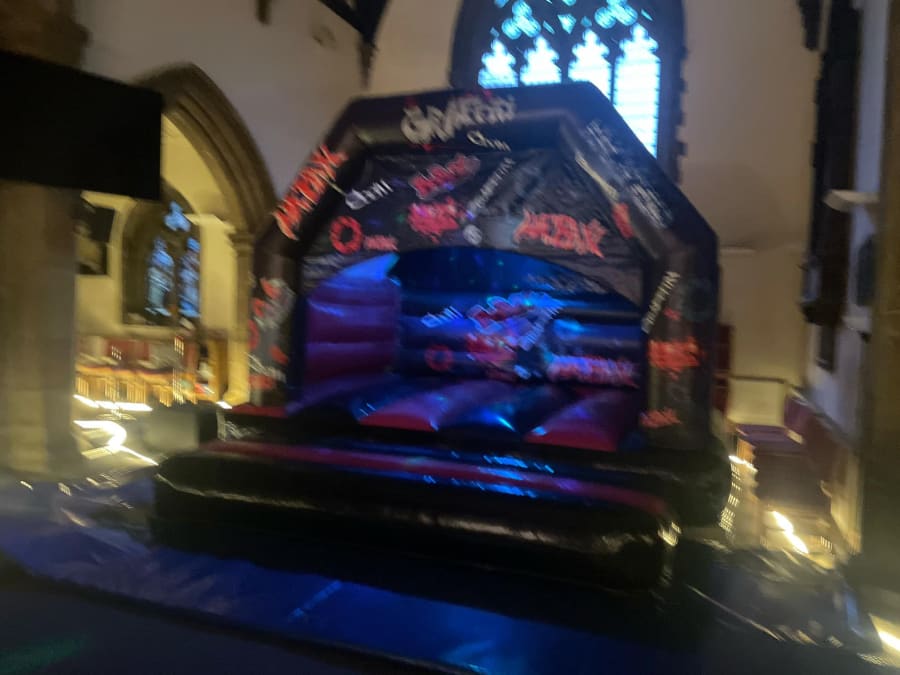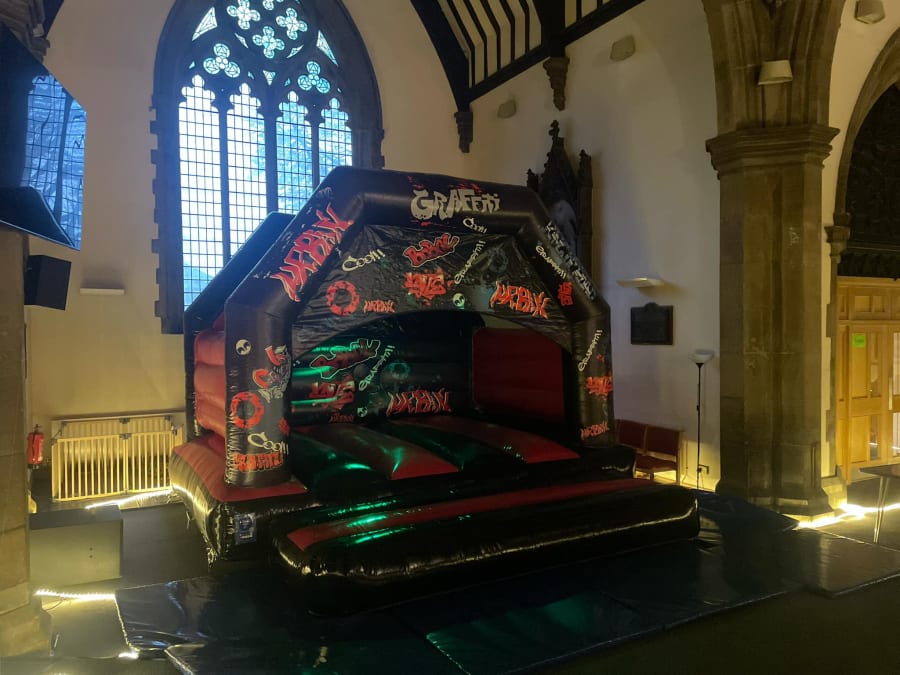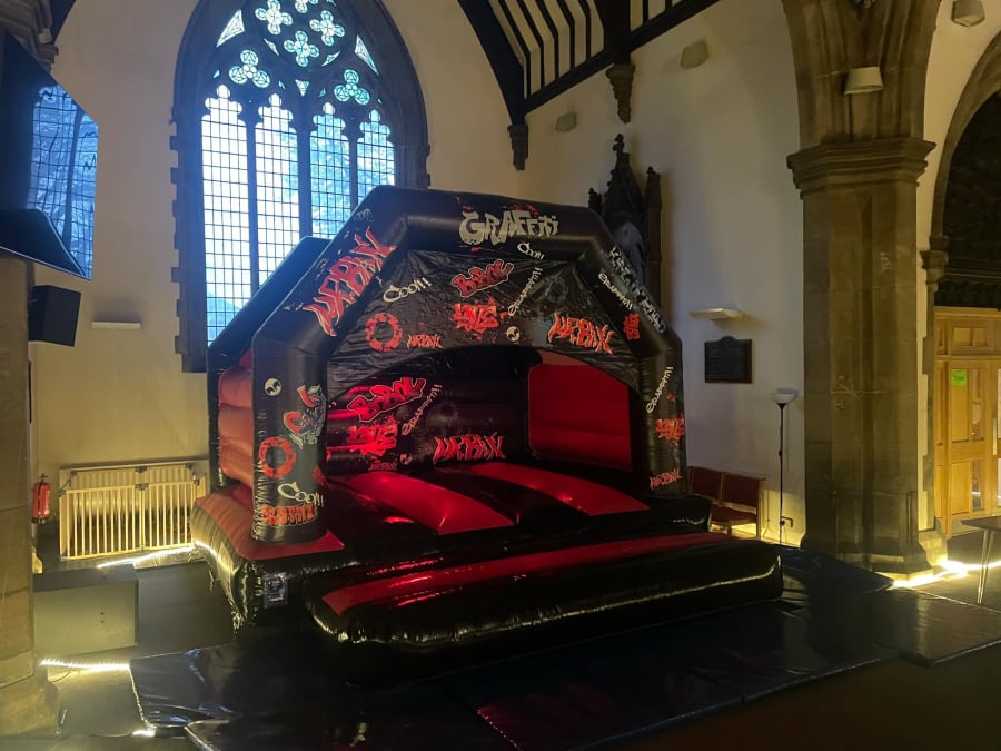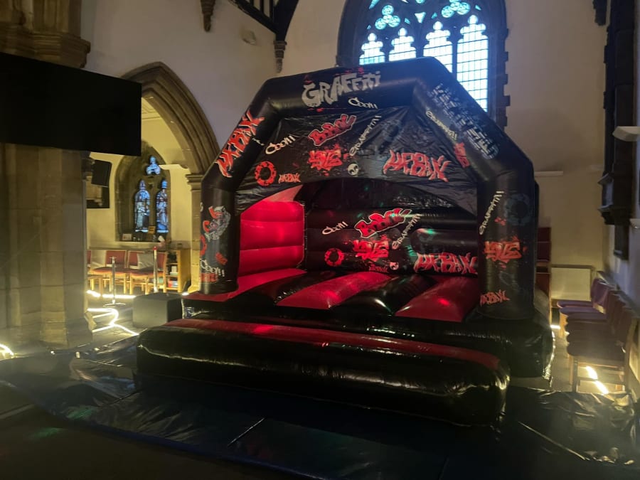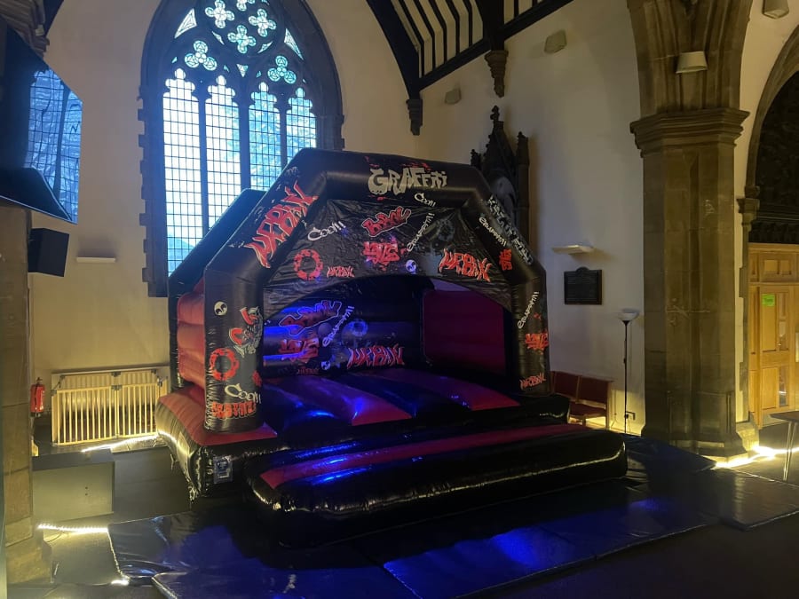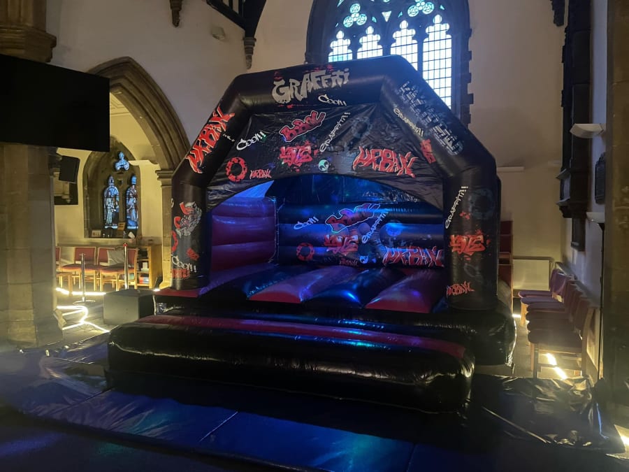 Get ready to bounce into fun with our spectacular ADULT & CHILDREN'S Disco ready! Graffiti Theme Bouncy Castle 15' by 15'. Perfect for all ages, this bouncy castle is designed to transform any gathering into a vibrant celebration. With its eye-catching graffiti design, it promises a visual feast that will captivate both children and adults alike.