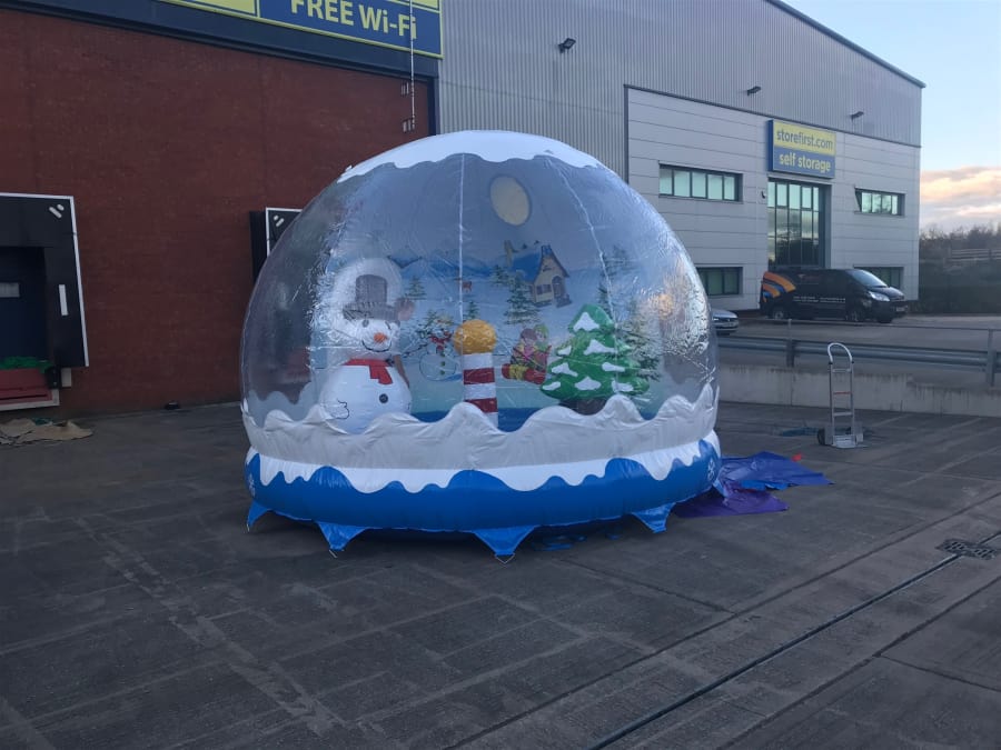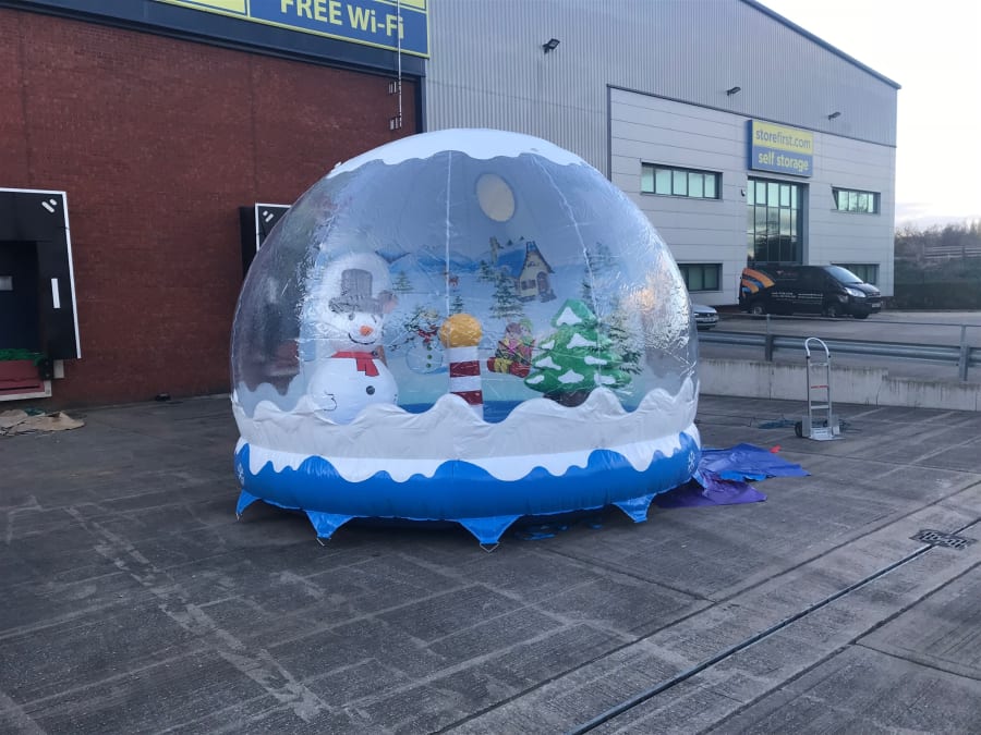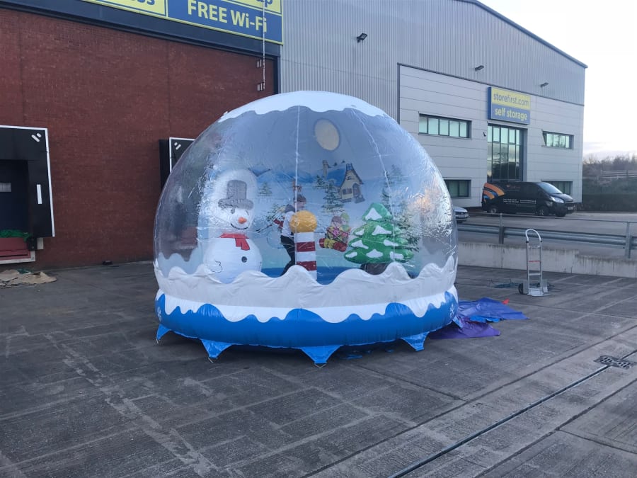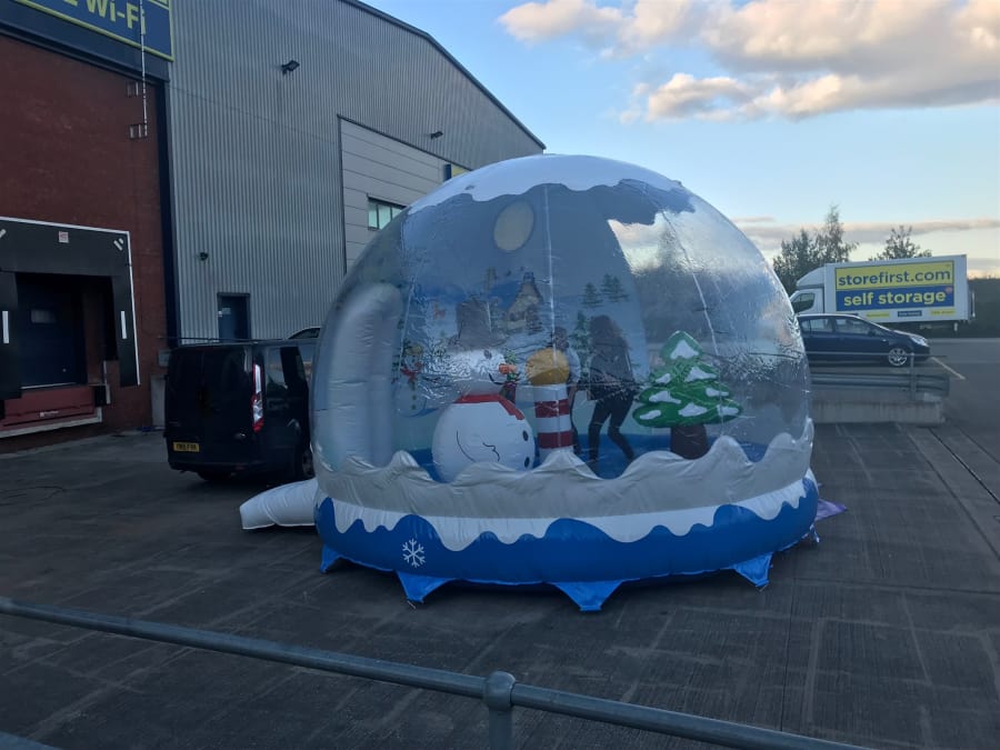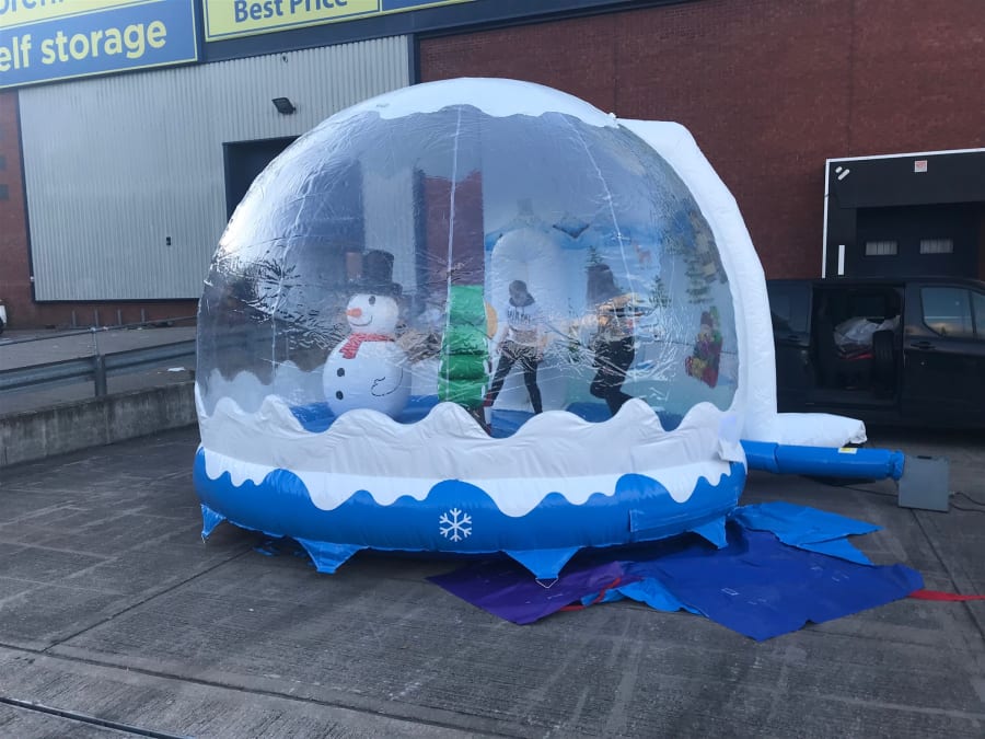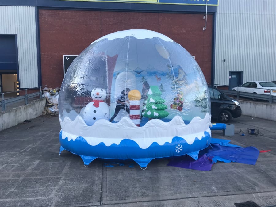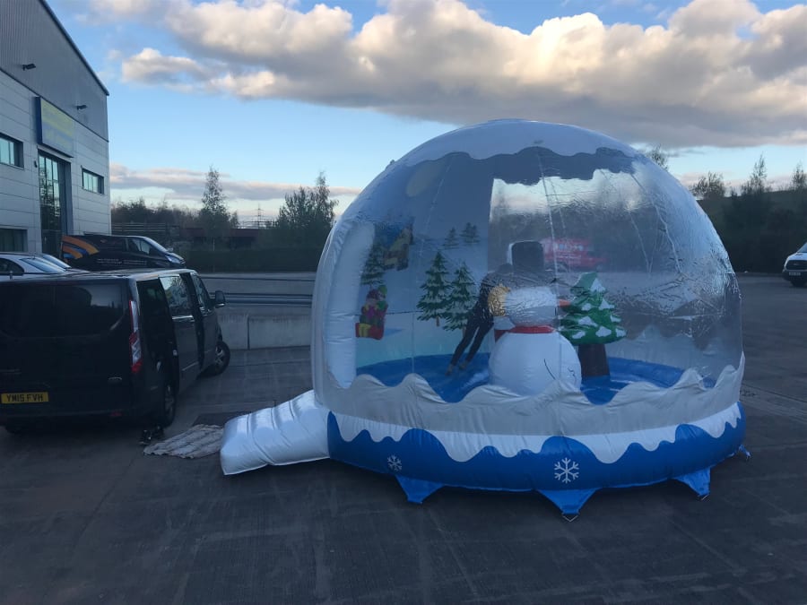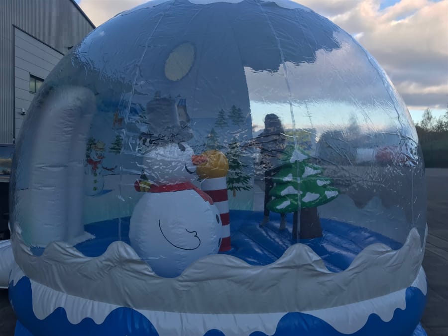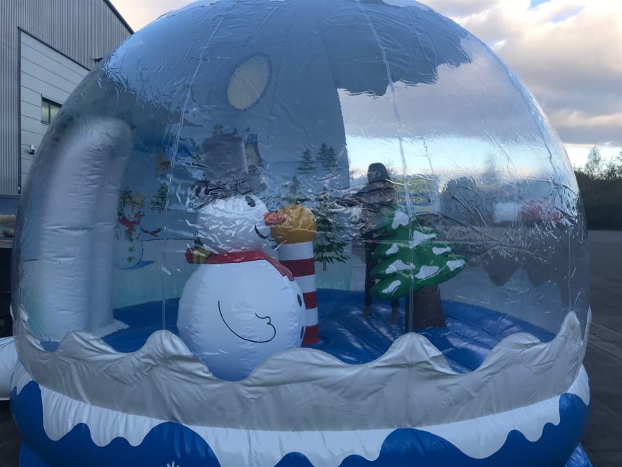 Our giant inflatable bouncy snow globe is now available to hire for your Christmas party. Inside you'll find frosty the snowman, a snow covered Christmas tree and a Christmas themed backdrop for those all-important Christmas photos.