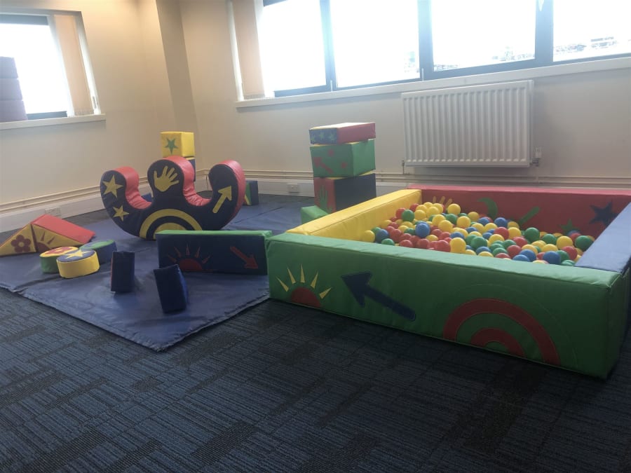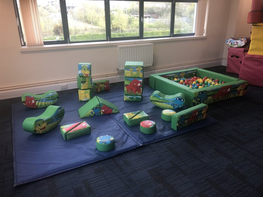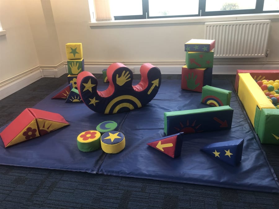 Includes 18 piece soft play set, ball pool, large double rocker and 10' x 8' play mat