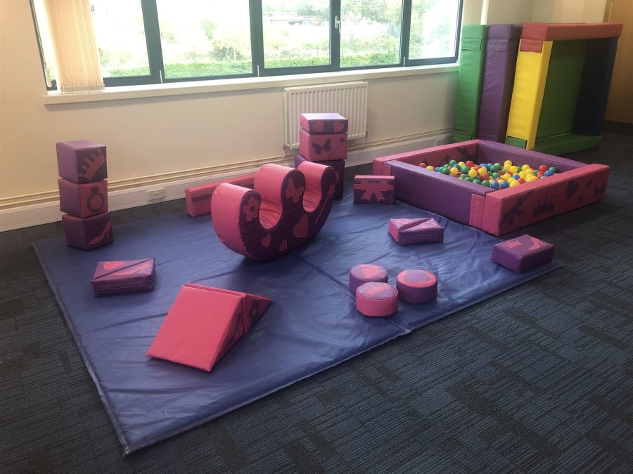Includes 18 piece soft play set, ball pool, large double rocker and 10' x 8' play mat