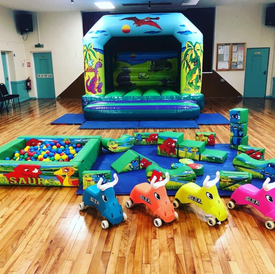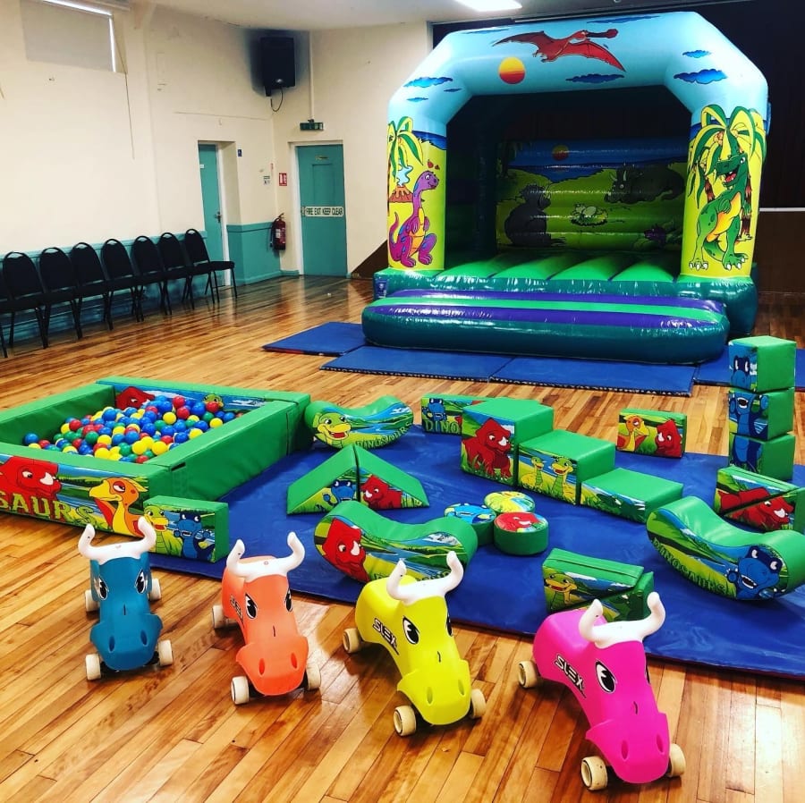 The Dinosaur Soft Play set and Bouncy Castle themed package consists of Bouncy castle,18 soft play shapes, 3 beanie rockers, ball pool and 4 ride ons, all nicely presented on a matted area. During the booking process you get a choice from 4x Didi Cars, wheels bugs, or slex bulls.