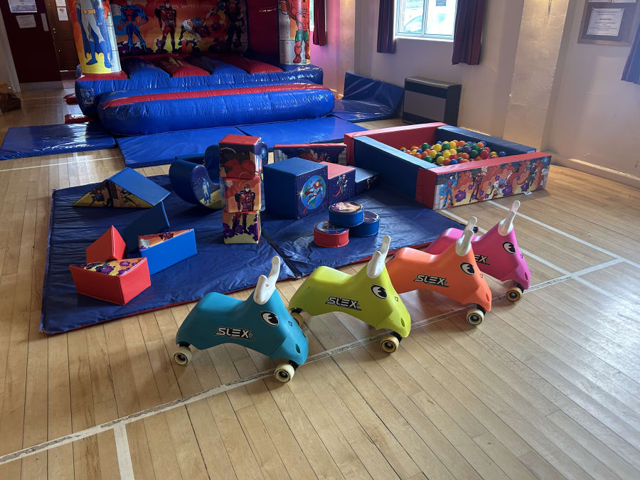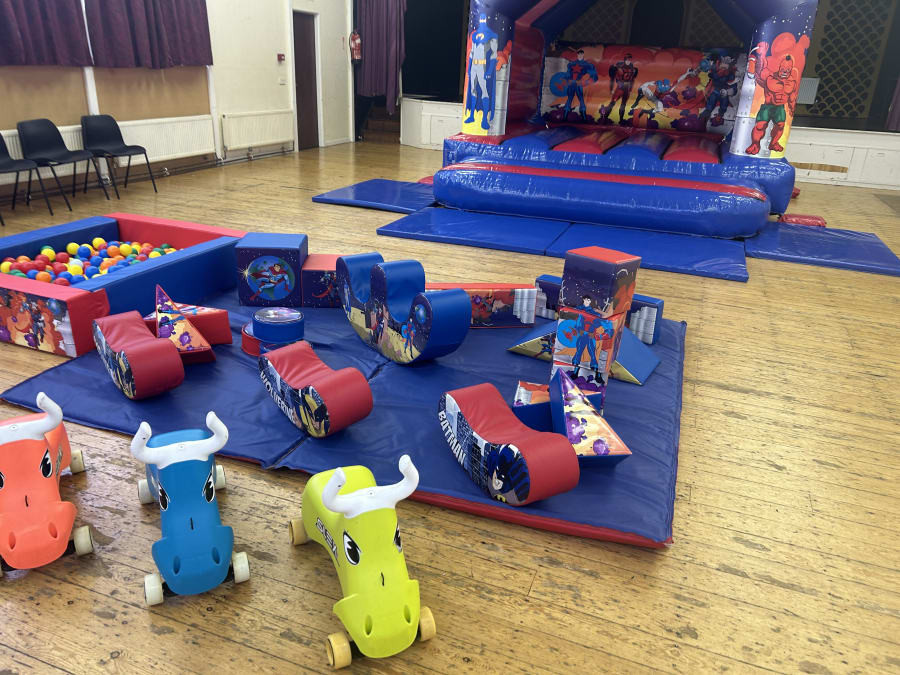 The Superhero Soft Play set and Bouncy Castle themed package consists of Bouncy castle,18 soft play shapes, 3 beanie rockers, ball pool and 4 ride ons, all nicely presented on a matted area. During the booking process you get a choice from 4x Didi Cars, wheels bugs, or slex bulls.
